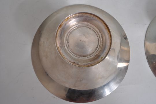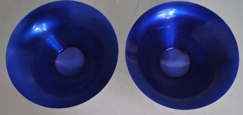 Meka of Denmark - A pair of vintage 20th century white metal and blue enamel bowls of tapering form raised on a circular lipped base. Stamped Meka Denmark to the base. Measures 8cm high x 16cm diameter.