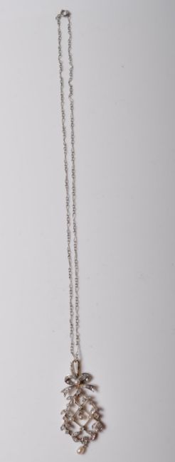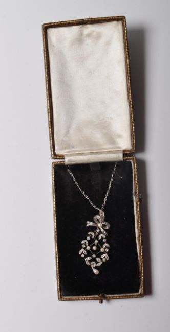 An early 20th Century Edwardian antique open work pendant necklace having a bow to the bale with foliates and lattice work beneath set with diamonds and seed pearls. Pendant mounted to a platinum necklace chain (marked 950). Weight 6.6g. Pendant measures 4.5cm. In fitted leather box.