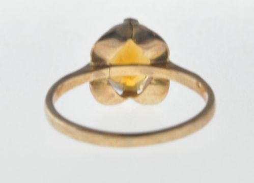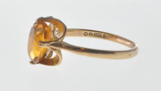 A hallmarked 9ct gold and citrine ring, The ring set with on oval mixed cut citrine in a scalloped prong setting. Assay marked for London. Weight 2.1g. Size L. Stone measures 9mm approx.