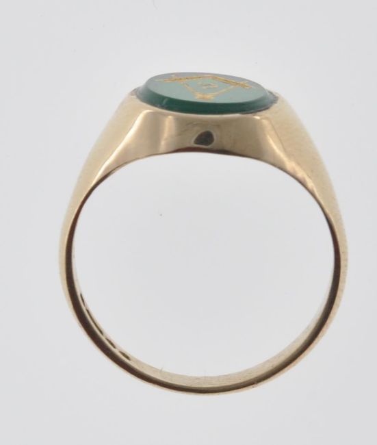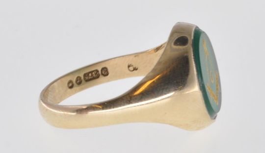 A hallmarked 9ct gold masonic signet ring having the square and compasses enamelled in green to the head. Marked 375. Hallmarked for London. Size T. Total weight 4.27g