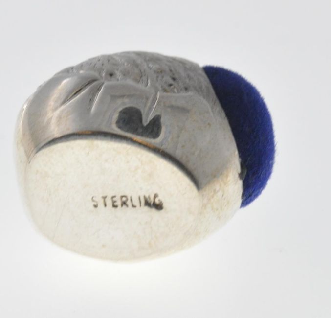 A stamped sterling silver pin cushion in the form of a chick with engraved features, yellow glass eyes and blue felt cushion to the back. Stamped sterling to the base. Measures 23mm tall. Weight 9.3g.