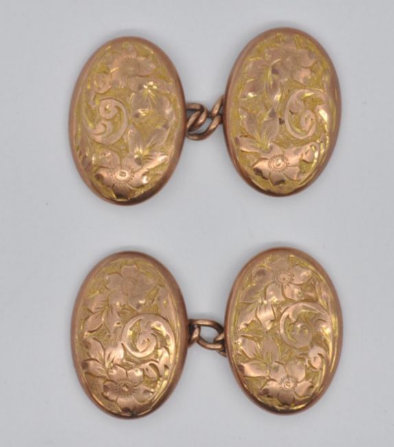A pair of hallmarked 9ct gold cufflinks of oval form having engraved floral details to the heads being united by chain links. Hallmarked Birmingham 1908. Weight 3.3g. Heads measures 1.6cm high.