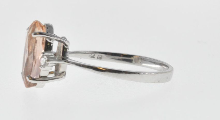 An 18ct white gold and orange topaz ring set with an oval cut topaz flanked by two round cut diamonds. Marked 750 to the interior of the band. Weight 2.4g. Size M.5. Topaz measures approx 11mm.