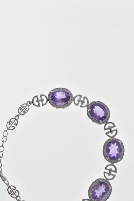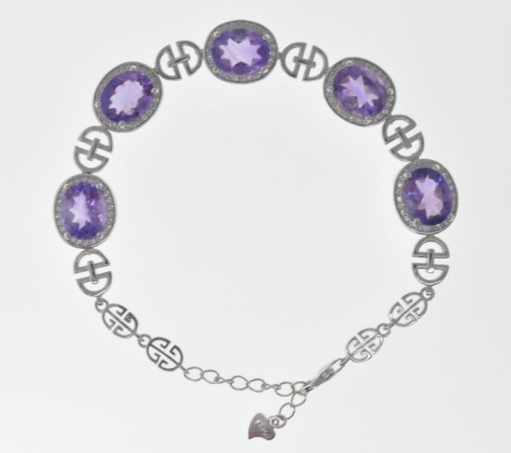 A stamped 925 silver ladies bracelet having a row of five amethysts each surrounded by CZ's and separated by silver spacers. Stamped to the clasp. Measures length 20cm. Total weight 13.8g.
