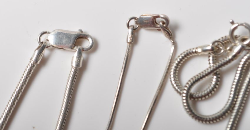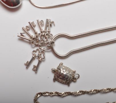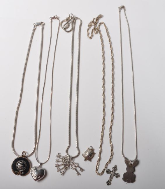 A collection of stamped 925 sterling silver ladies pendant necklaces to include a snake chain with rabbit pendant, another snake chain with a key shaped pendant, a black enamelled pendant on a snake chain, a crucifix and a heart shaped pendant. Total weight 60.2g.