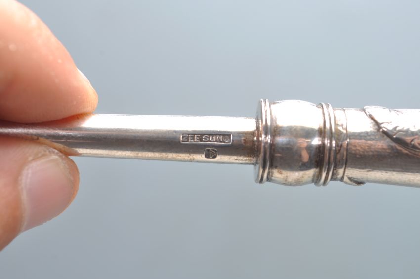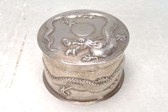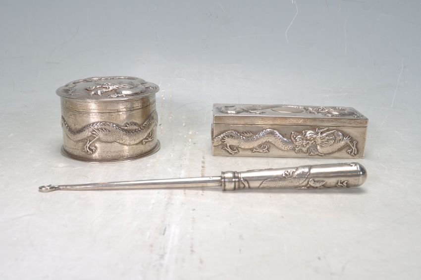 A group of early 20th Century chinese export silver by Zee Sung of Shanghai to include a round dressing table pot, a rectangular box and a button hook all having repousse high relief decoration in the form of Chinese dragons. All marked Zee Sung. Round box measures 9cm diameter. Total weight approx 400g.