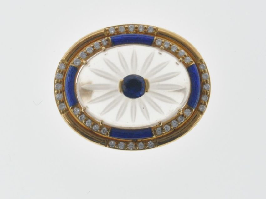 A vintage 18ct gold brooch set with an oval rock crystal panel with floral engraving set with an oval cut sapphire to the centre, the mount having blue enamel borders set with diamond accent stones. Marked 750 with London import marks dated 1986. Measures 2.7cm wide. Weight 9.5g.