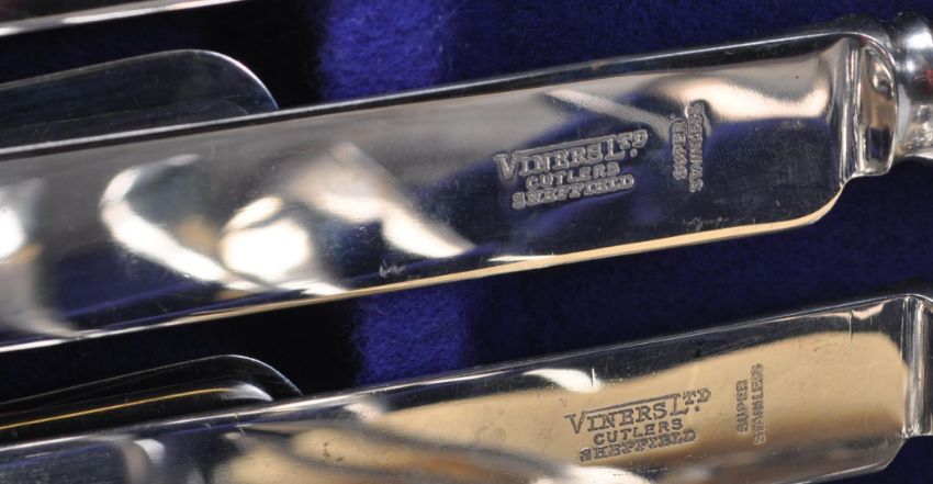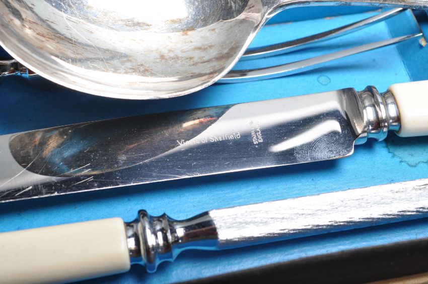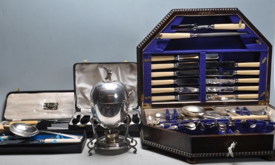 A collection of vintage 20th century silver plate ware / tableware to include caseted carving set, boxed carving set, serving spoons, Benetfink & Co silver plated egg boiler and Viners LTD canteen cutleries in a wooden mahogany case.