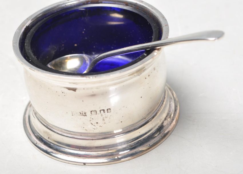 A Walker and Hall silver hallmarked cruet set to include mustard pot, table salt and pepper shaker, the table salt and mustard pot having blue glass liners. Hallmarked London 1934. Weight 107g.