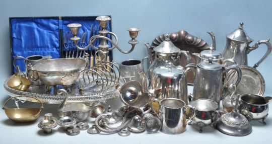 A collection of vintage 20th century silver plate comprising of tankards, toast racks, toast racks, candlesticks, trays, cutlery and more.