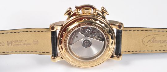 A gentleman's Buran Flagman Chronograph Automatic 25 jewels limited edition No. 054/100 wristwatch with Cal 7751. The watch having having white dial with arabic numerals to the chapter ring, day date to the arabic numerals to the chapter ring,60-second chronograph (central stop second),  30-minute counter (on 12h) with day and month aperture, secondary second dial to 9 o'clock and 12-hour counter (on 6h). The white metal movement is unmarked and set in a yellow metal case with sapphire glass back and black leather straps. The watch come complete with owner manual and original presentation box. Condition: good condition, no visual damage. At the time of arriving the watch was ticking and winding but sold as untested.
