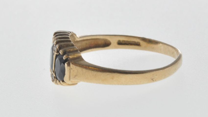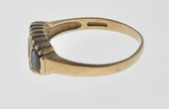 A hallmarked 9ct gold three stone ring having three oval cut black stones surrounded by four white accent stones. Stamped 375. Hallmarked for Sheffield. Size R. Total weight 2.5g.