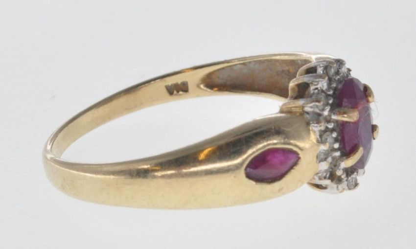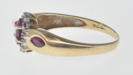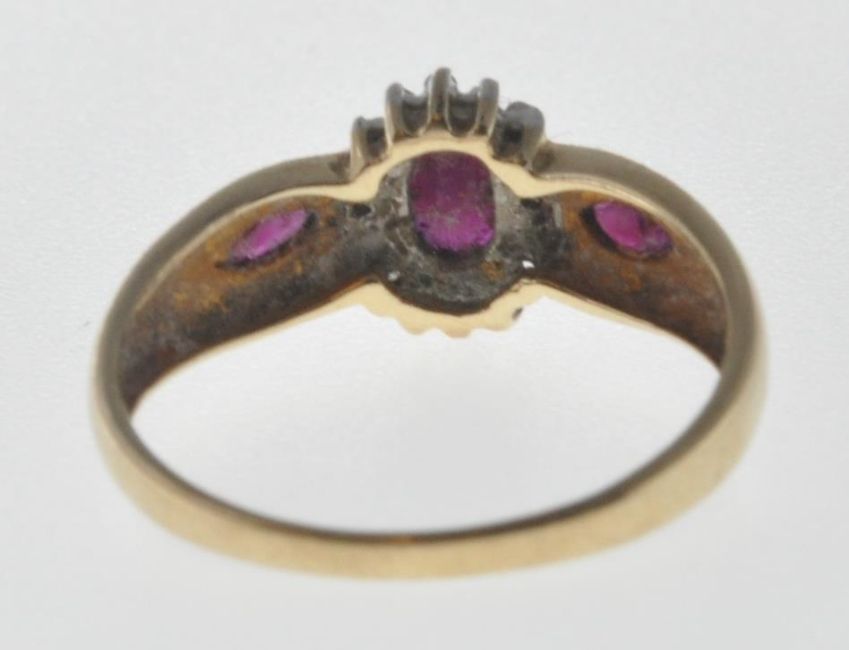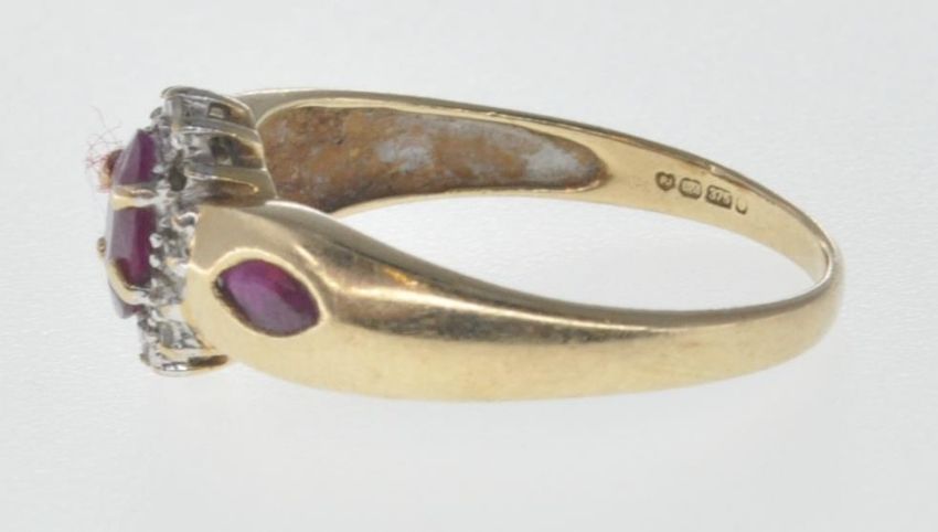 A hallmarked 9ct gold ring having a central pink stone held in a claw setting, surrounded by a halo of white stones and having two more pink stones gypsy set to the shoulders. Ring size O.5. Total weight 2.2g.