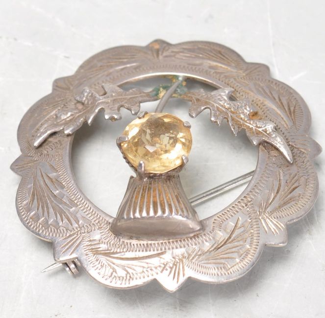 A group of vintage silver jewellery to include a Scottish silver thistle brooch set with a yellow stone ( hallmarked Edinburgh 1959, makers marks for WBs), an antique Sir john Bennett Ltd silver converted pocket watch wrist watch (import marked for London 1923), an engine turned silver compact (hallmarked Birmingham 1941), a silver ring set with a purple stone and marcasites, a flat link silver necklace chain (marked 900), a flat linked necklace chain (marked 925) with another necklace chain (marked 925). Weight of jewellery 55.5g.