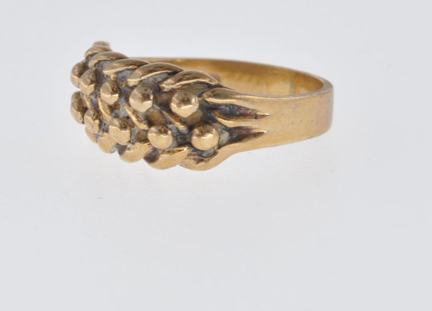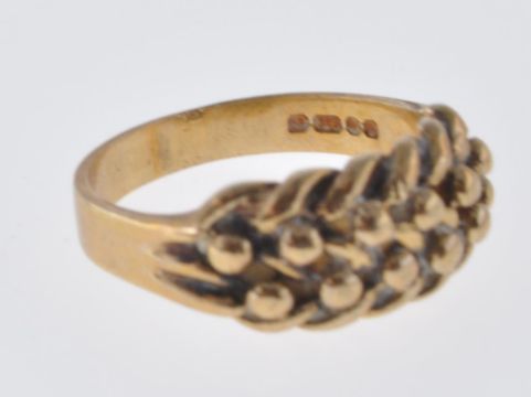 A vintage hallmarked 9ct gold Keeper ring having a lattice work head. Hallmarked London 1982. Weight 3g. Size K.