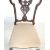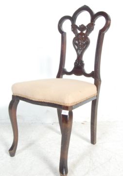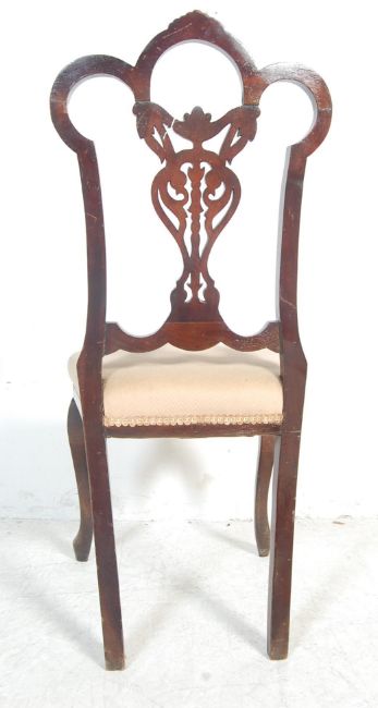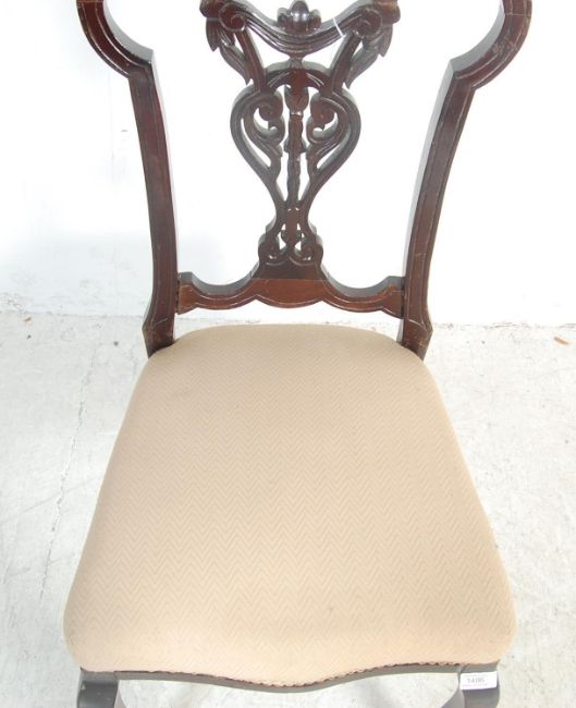 An early 20th century mahogany dining chair having a palmette motif to the top of the back board, pierced decoration to the splat, an upholstered seat stitched with gold brocade and cabriole legs. 97cm h x 47cm w x 45cm d