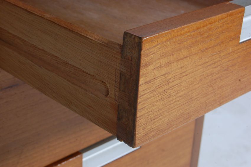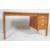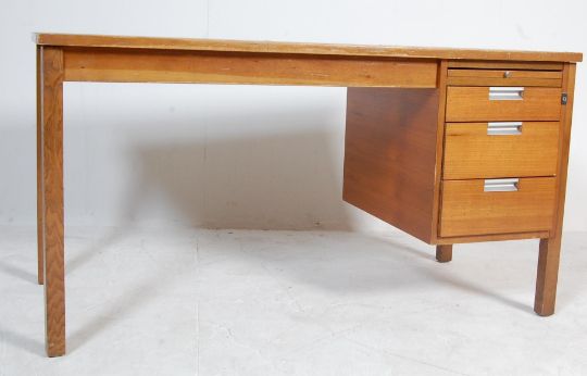 A retro vintage late 20th century teak desk having a bank of three drawers to the right with angular metal handles raised on square supports.73cm h x 135cm w x 75cm d