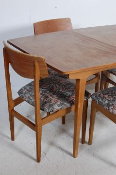 A vintage retro 20th century Danish inspired teak wood extending dining table and four dining chairs. The table having two pieces top with a extending leaf to the underside raised on shaped legs complete with four dining chair with curved back rests, upholstered seats raised on shaped legs united by stretchers. Measures, 75 cm H x 167 cm W x 80 cm D