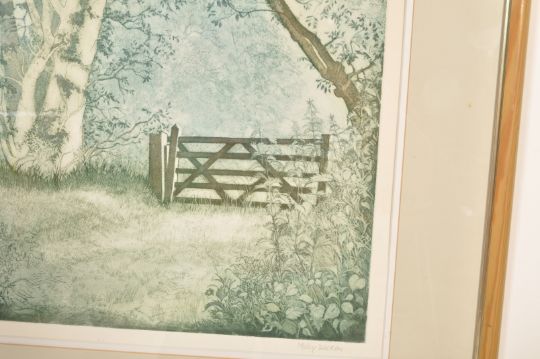 Molly Dicker (20th century), wooded landscape with farm gate, The End of the Wood, etching, signed in pencil. Limited 6/16.  70cm h x 81cm w