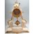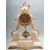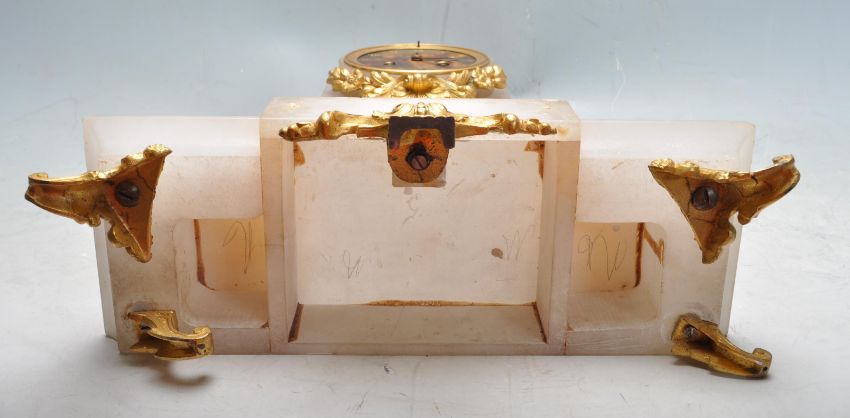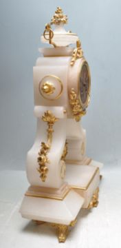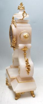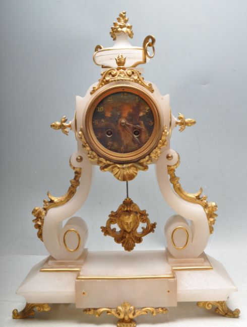 A Rococo style Louis XVI reproduction alabaster garniture mantle clock having ornate yellow metal acanthus leaf fittings to the legs and face and the face being hand painted with a landscape scene. Measures 45cm tall.