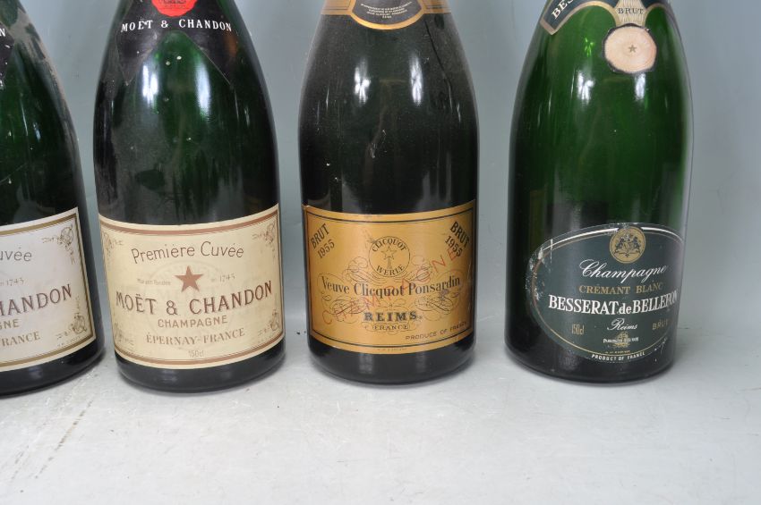 A collection of vintage ex shop stock used champagne bottles, brands to include Moet Chandon, Chateau Le Grange, Muscadet, Lambert & Cie etc. Measures, 38 cm Tall