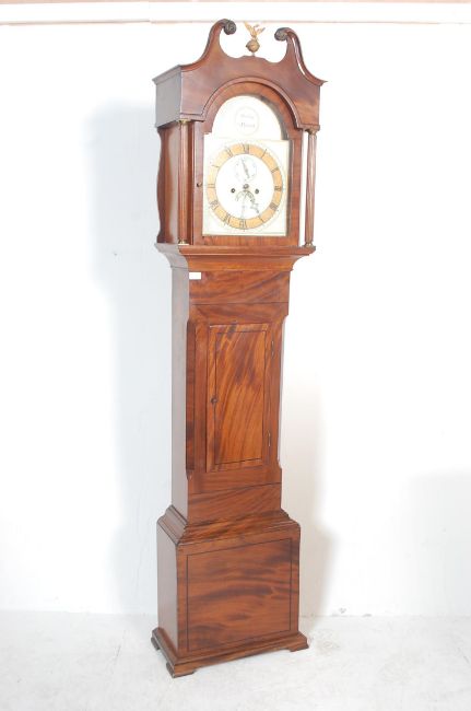 A early 19th Century Georgian mahogany longcase grandfather clock by Bartley of Bristol. The clock having a white enamelled dial with gilt arabic numeral chapter ring with pierced hands and subsidiary dial to twelve. The case having a swan neck pediment with central eagle finial above reeded columns flanking the glazed door. Measures, 207 cm H x 24 cm W x 47 cm D