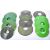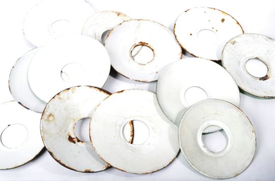 A collection of twelve 20th Century retro vintage industrial porcelain enamel UFO saucer pendant ceiling light shades in varying tones on green with white inners. Largest measures approx; 31cm diameter.