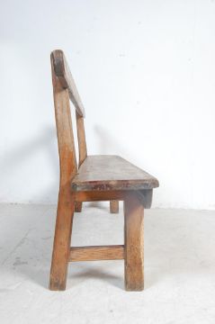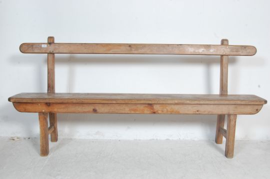 A 19th century Victorian country pine bench / pig bench. The 7ft bench having a shaped backrest raised on shaped legs united by stretchers. Measures, 90 cm H x 197 cm W x 34 cm D