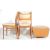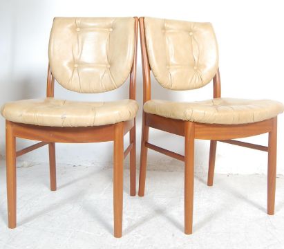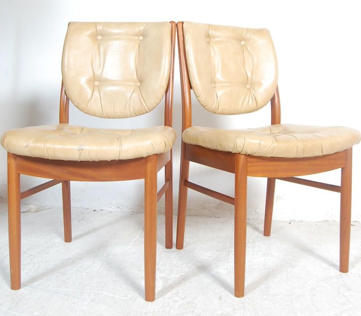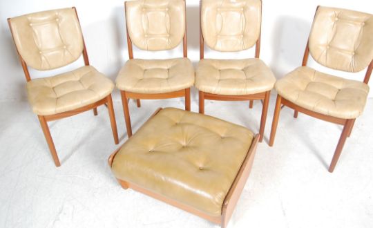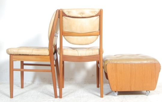A set of four vintage retro G plan dining chairs having teak wood framed with faux leather back rests and seat panels with button back upholstery, together with a matching footstool.