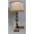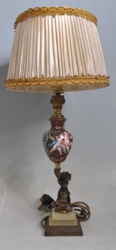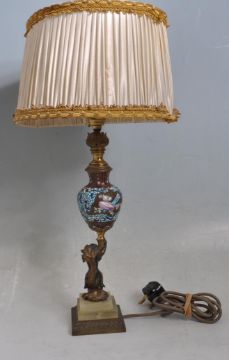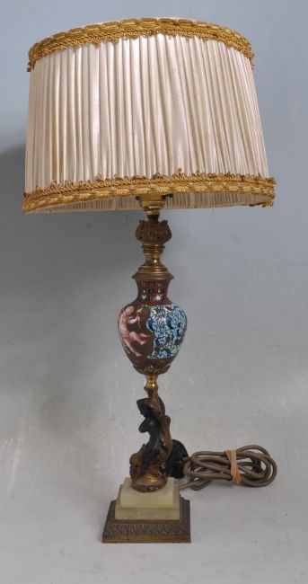 A 20th century antique style brass and enamel table lamp / desk lamp. The lamp having an unusual column decorated with putti to the centre bulbous column supported by a brass putti riding a dolphins raised on green marble and brass square base.