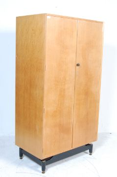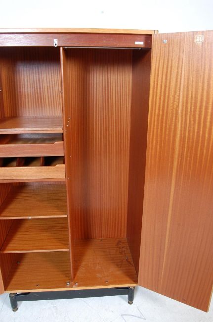 A vintage retro mid 20th century circa 1950’s teak wood wardrobe by G Plan from librenza designed by Ernest Gomme. The wardrobe having twin doors opening to reveal a fitted interior raised on black wooden base.178cm h x 92cm w x 54cm d