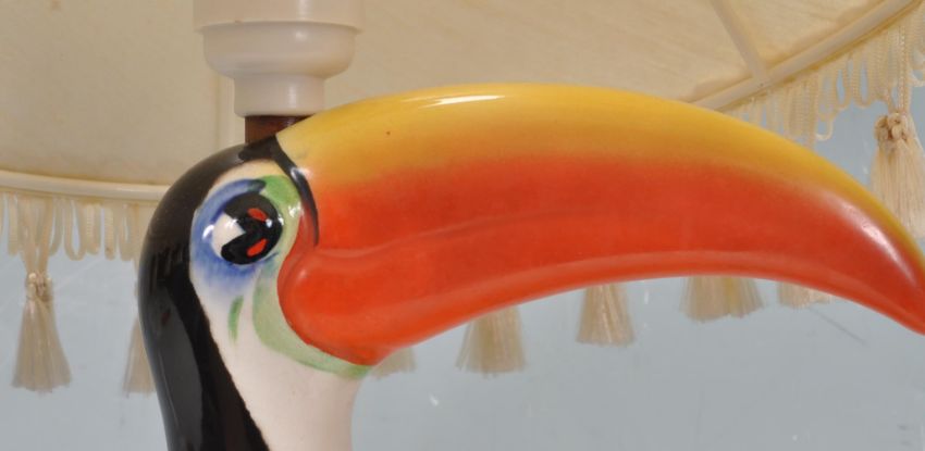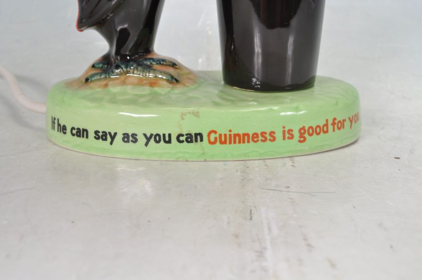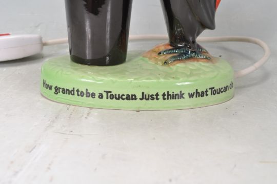 A vintage retro ceramic Carlton Ware Guinness advertising lamp having a green base with classic toucan and Guinness pint, reading 'How grand to be a Toucan, Just think what a Toucan can do, if he can say as you can Guinness is good for you' to the base.