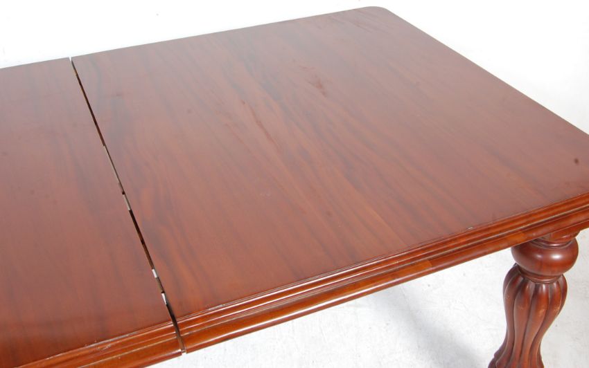 A good Victorian style mahogany extending dining table and set of 8 chairs. The table being raised on fluted legs with fitted frieze and extending top above. Together with matching set of 8 balloon / kidney backed dining chairs. Historic repair to one leg.