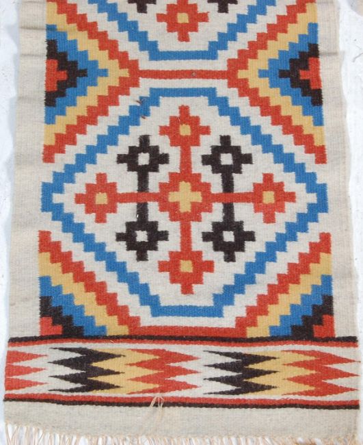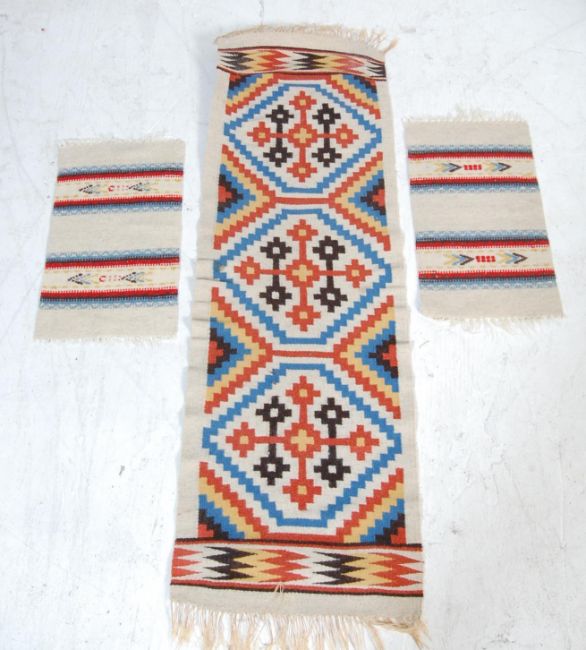 A group of three vintage 20th century Norwegian Scandinavian handwoven wool table runner / wall hanging rugs being decorated with blue, red yellow and black geometrical motifs on a cream background.