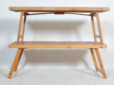 A pair of 20th century retro vintage wooden infantile school folding tables. The tables of a rectangular form raised on twin folding legs. Measures 45 cm H x 123 cm W x 47 cm D
