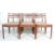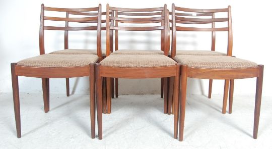A set of six retro mid 20th century vintage teak wood G Plan Ernest Gomme dining chairs with upholstered seats raised on turned legs united by stretchers. The curved back rests with three rails. 80cm h x 46cm w x 43cm d