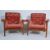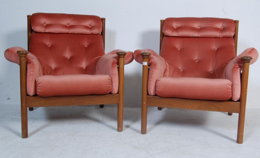 A pair of retro vintage 1970s mid 20th century lounge chair / armchair / easy chair having upholstered back rests and elbow rest in pink fabric raised on upright teak supports