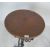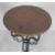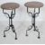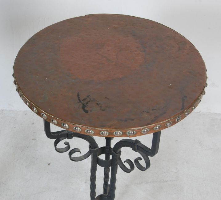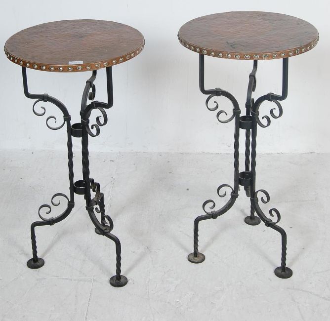 A pair of contemporary cast iron tavern tables having a circular copper table top with studded edges top raised on scrolled supports atop a tripod base. Measures 78 cm H x 41 cm Diameter