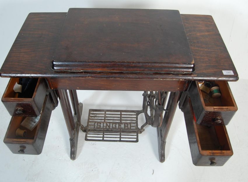 An early 20th century Singer sewing machine table having an oak table top with two banks of drawers on a cast iron base. Measures  79 cm H x 87 cm W x 42 cm D