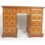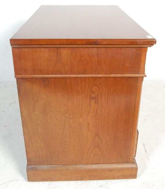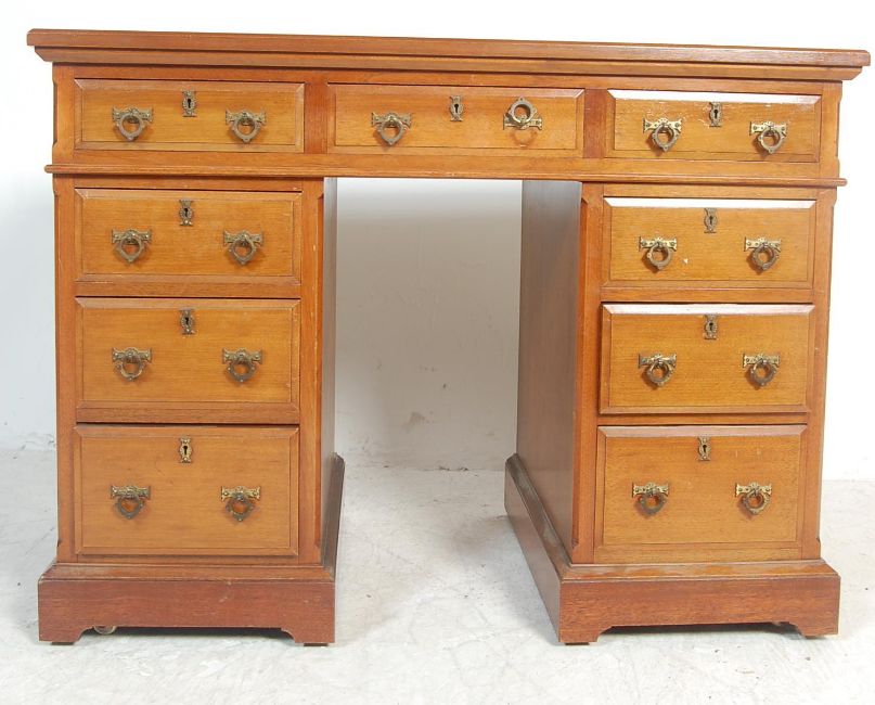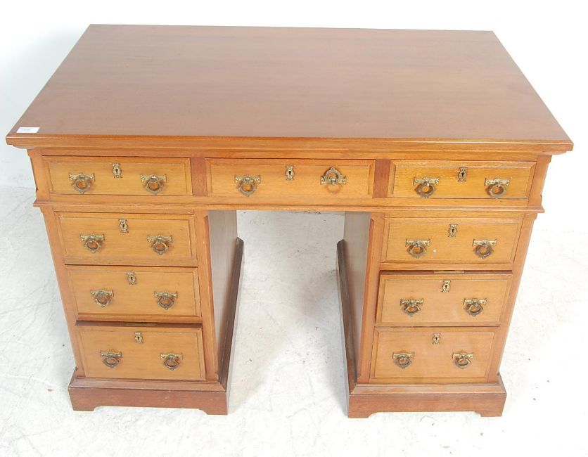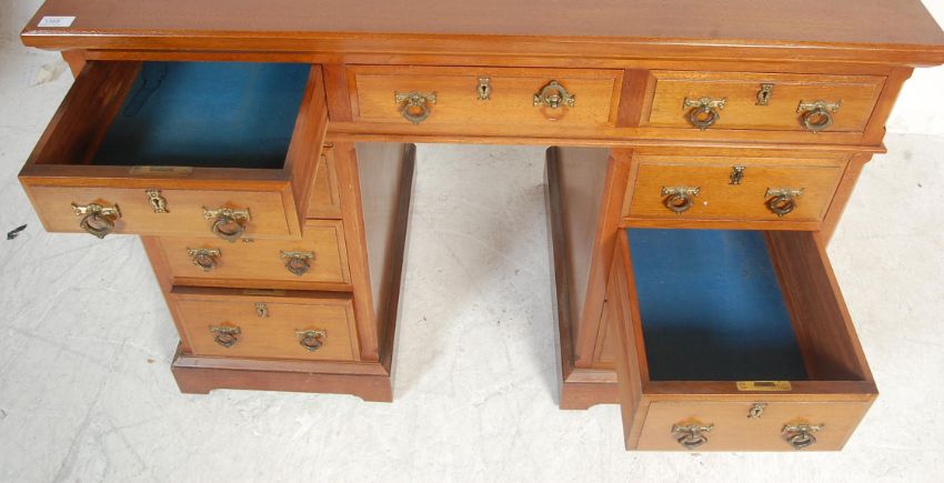 A late Victorian 19th century Arts and Crafts inspired  walnut twin pedestal desk having a flared top over a run of three drawers with  arts & crafts styled brass drop ring handles raised on two pedestals atop plinth base. Measures, 79 cm H x 106 cm W x 60 cm D