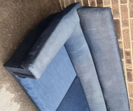 A retro vintage mid 20th Century 1950's / 1960's Danish four person sofa settee of curved form raised on tapering wooden legs with blue fabric upholstery. Measures approx; 76cm x 240cm x 45cm.