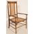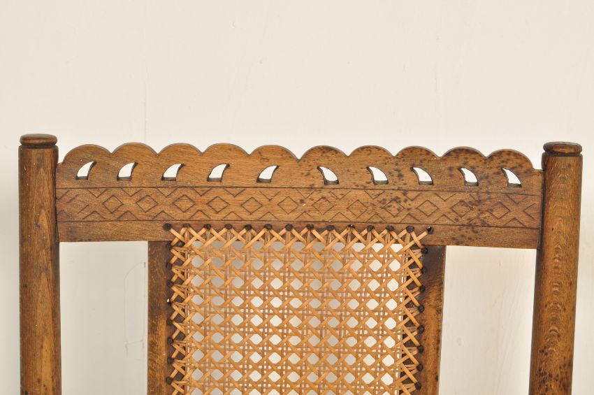 An early 20th century circa 1920’s oak and cane elbow bedroom chair / armchair. The chair having pierced and carved top rail, cane backrest flaked by two turned back post, cane seat, shaped armrest raised on turned on turned legs united by stretchers. 92cm h x 52cm w x 45cm d