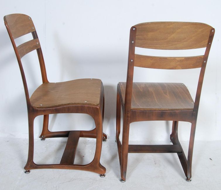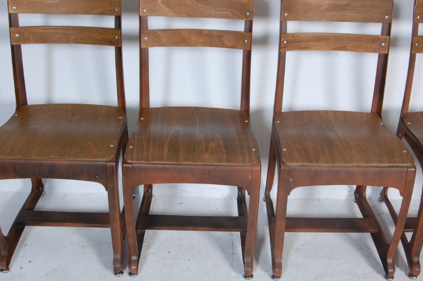 A collection of six retro vintage industrial dining chairs having faux wood metal frames, plywood back rest and seats raised on shaped metal supports united by a single stretcher. 84cm h x 40cm w x 40cm d