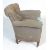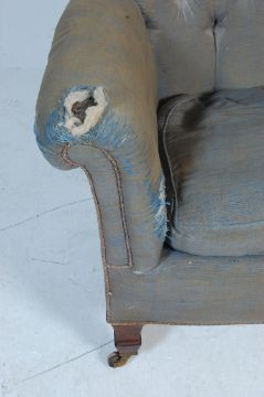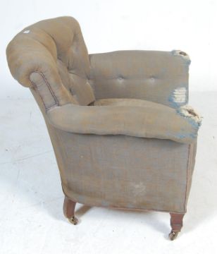 An antique late 19th century early 20th Century armchair / bedroom chair / fireside chair / library armchair having a tapering back, scrolled elbow rests overstuffed cushion raised on square mahogany feet on castors. Heal and Sons badge applied to the underside. Measures 77cm h x 86cm w x 75cm d