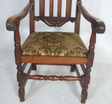 A large early 20th century Carolean revival oak throne chair in the manner of Daniel Marot. Carved top rail over railed back rest, shaped elbow rests, drop in seats, with turned legs united by stretchers. 123cm h x 55cm w x 66cm d