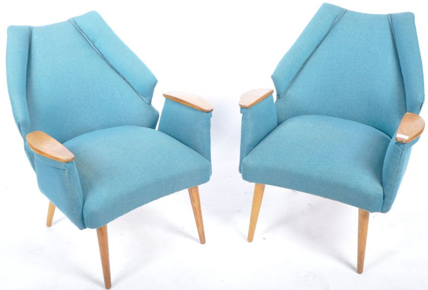 Miroslav Navratil - A matching pair of retro vintage 20th Century Czechoslovakian oak framed easy / lounge chair / fireside armchairs. Each chair having shaped wingback backrest with show wood oak armrests and sprung seat pads. Each being upholstered in a blue fabric and raised on splayed tapering oak leg supports. Each chair measures approx 84cm x 71cm x 67cm.