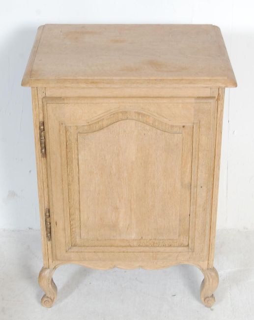 A collection of four vintage 20th century antique style limed oak furniture comprising of a bedside cabinet, stool, a table and more. Measures, 66 cm H x 49 cm W x 37 cm D