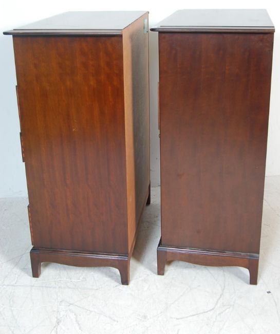 A pair of vintage retro 20th ceramic mahogany colour Stag Minstrel chest of drawers of a large pedestal form with short drawers above long drawers with ring handles raised on bracket feet. 113cm h x 82cm w x 47cm d