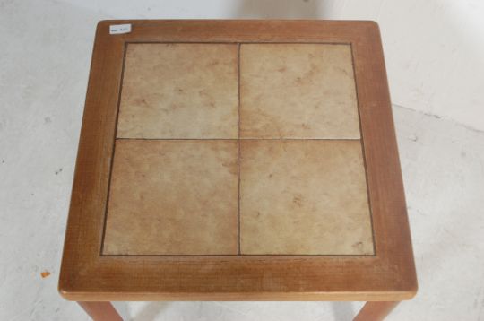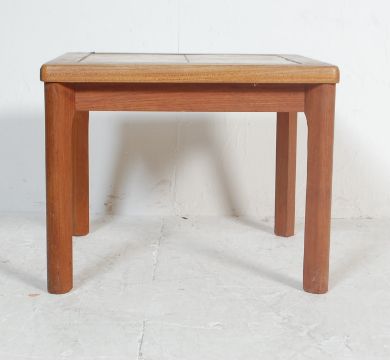 A retro vintage 20th century Danish tile top coffee table of square form. The table has four tiles to the top in retro style raised on circular tapering supports. Stamped made in Denmark to the underside