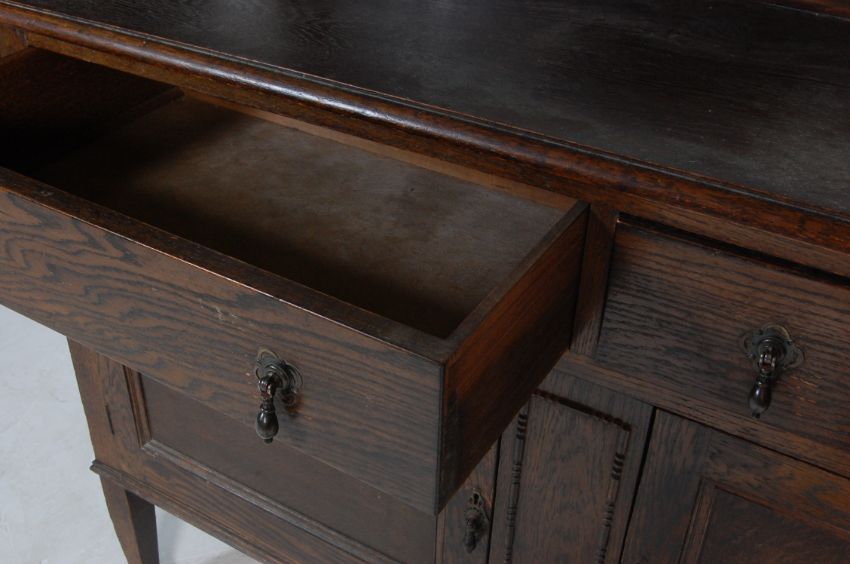 An early 20th century oak mirror back sideboard credenza / dressing table having an oval bevelled glass mirror atop set in a arched gallery back above two short drawers over twin drawers cupboard fitted with shelves raised on shaped legs. 163cm h x 137cm w x 47cm  d